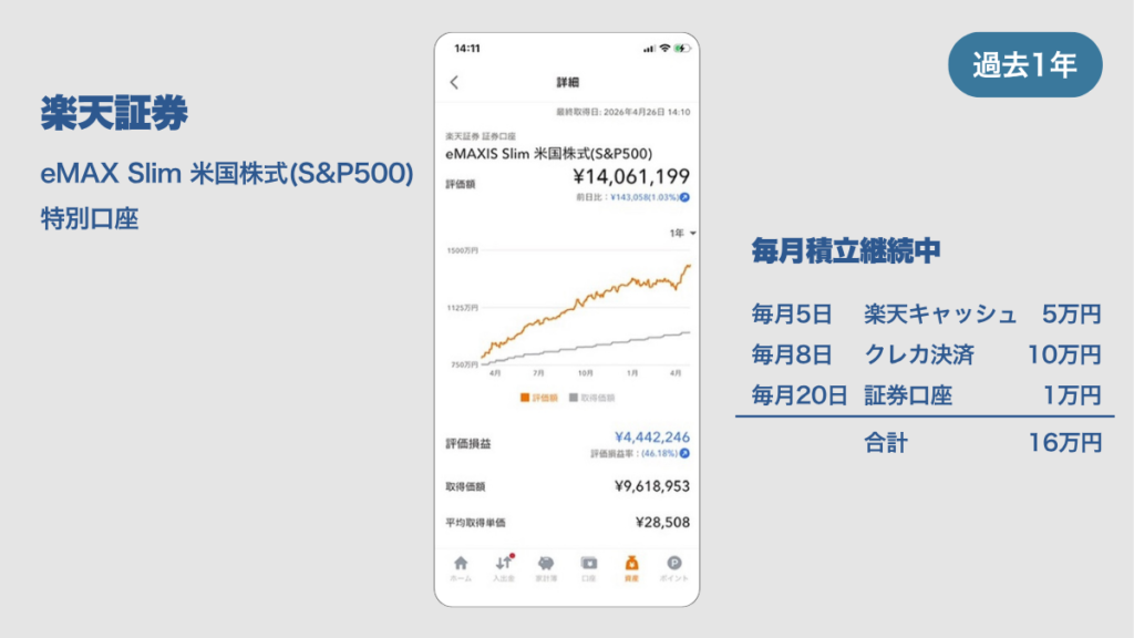 そして、毎月合計16万円をこの楽天証券(特別口座)でS&P500の購入を続けてきたけれど、